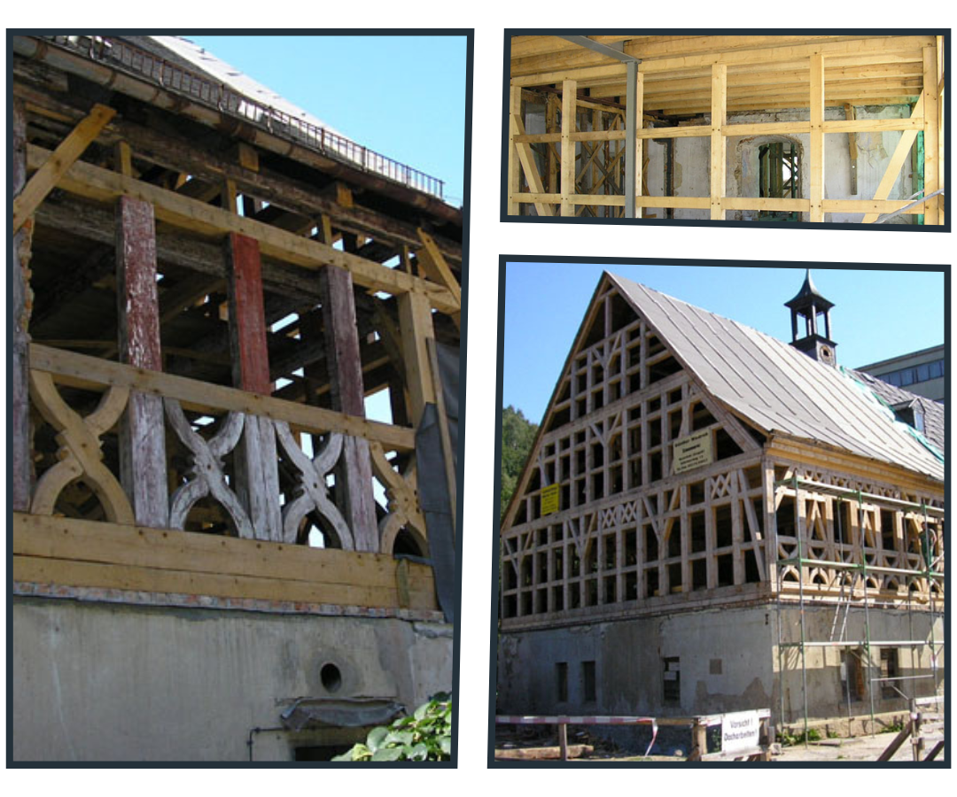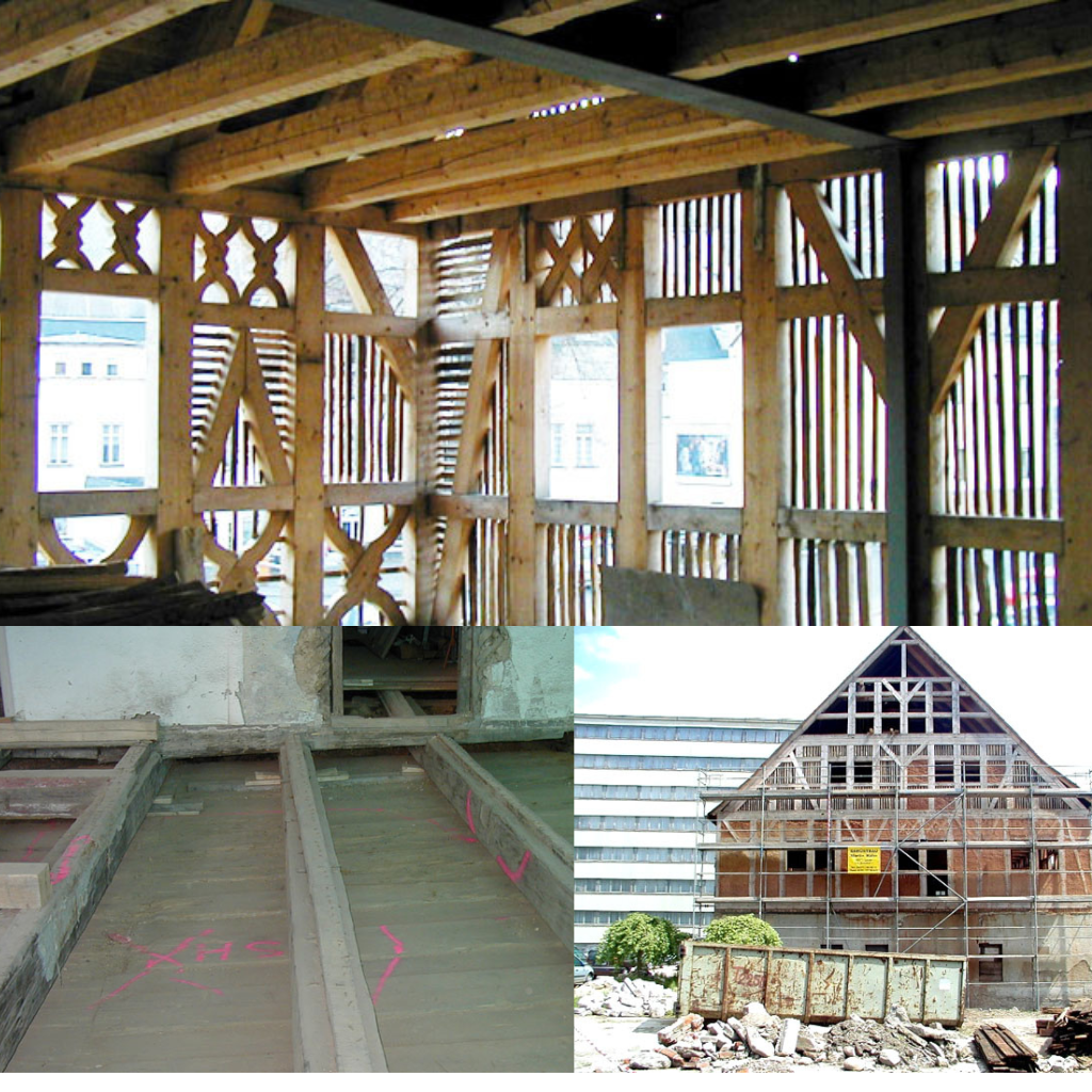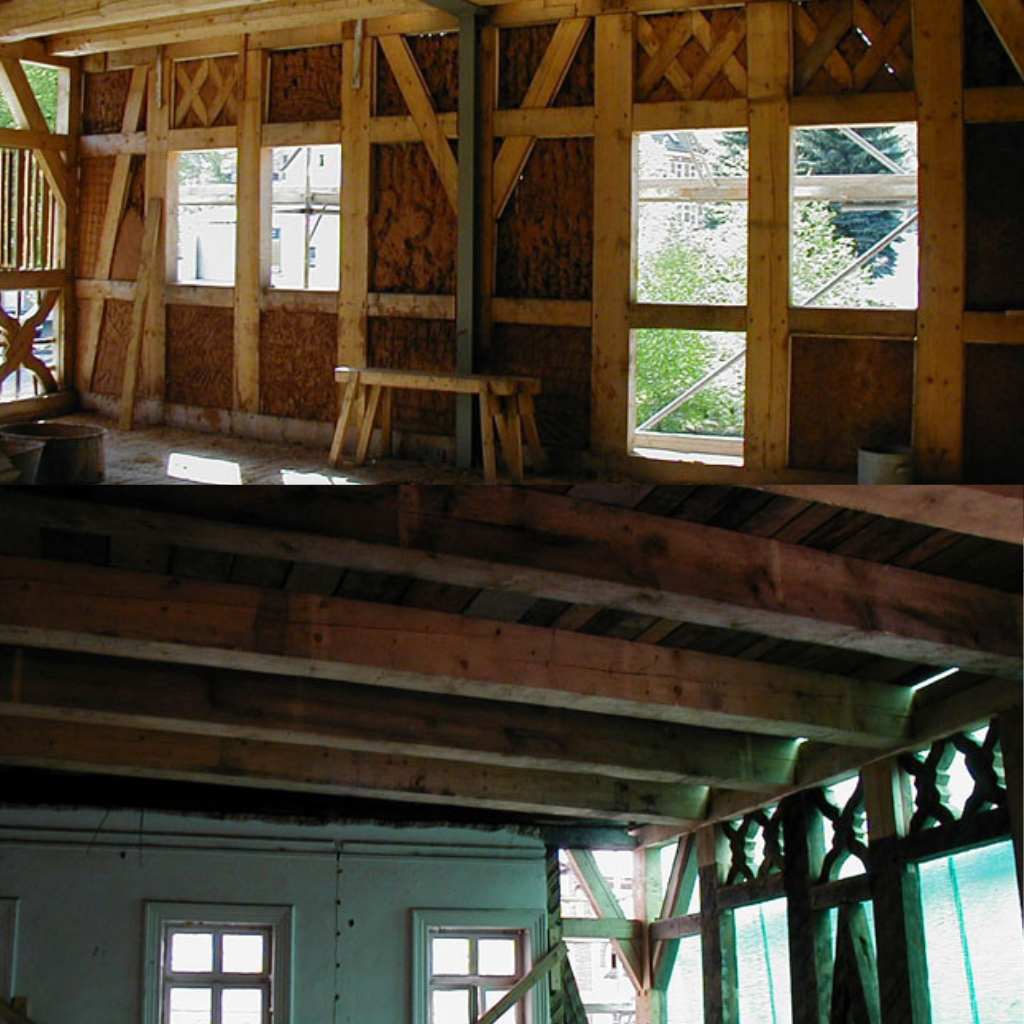1. Boden, Alt und Neu bilden den neuen Dachstuhl.