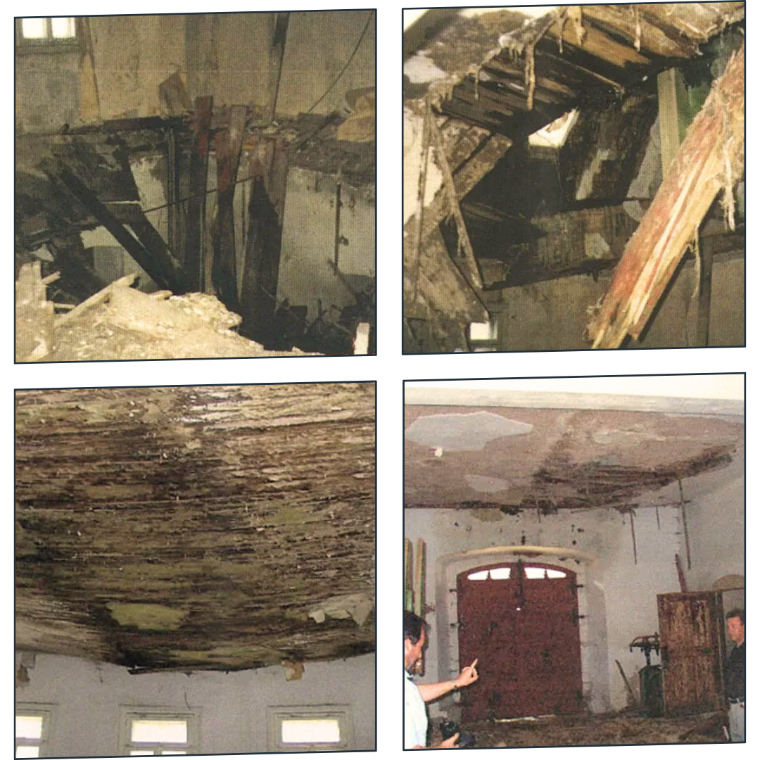 Nach Ausräumen der Deckenschüttung wird das Ausmaß der Holzschädigung der historischen Decke sichtbar.