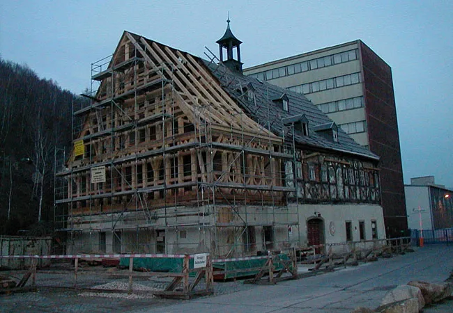 Letzte Abschnitte der Dachkonstruktion erneuert, insbesondere die Rekonstruktion des historischen Hängewerkes (König).