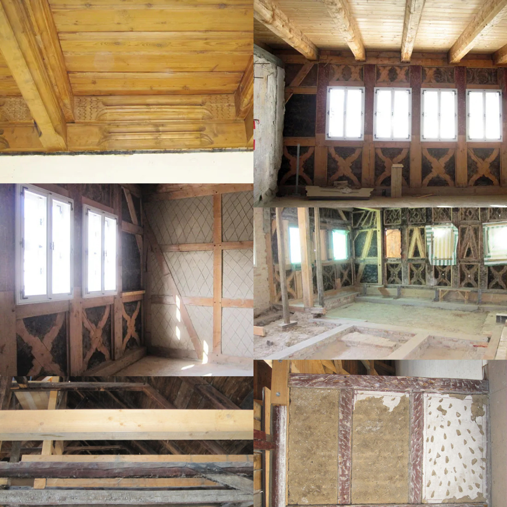 Die Rekonstruktion der Fachwerkaußenwände wurde durchgeführt, einschließlich eines Teilbereichs der Süd-Seite des Daches.Obergeschoss: