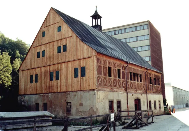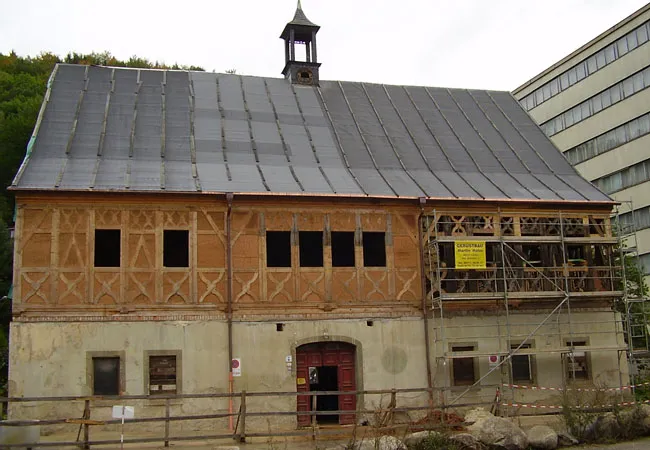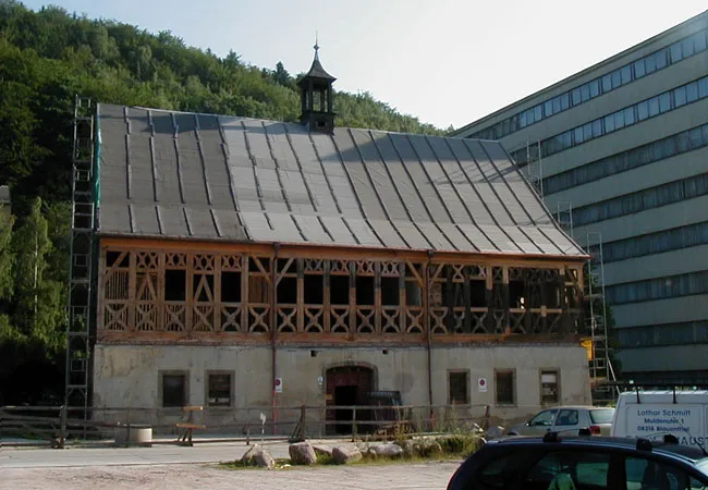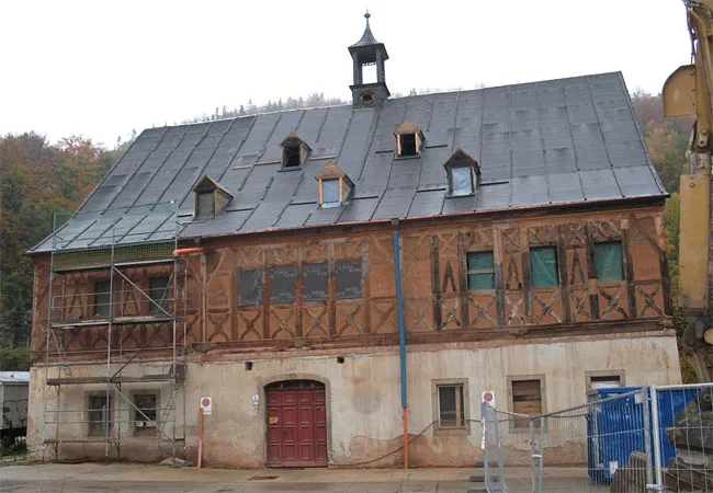 Der West-Giebel hat eine Wetterschutzschale nach historischem Vorbild erhalten.