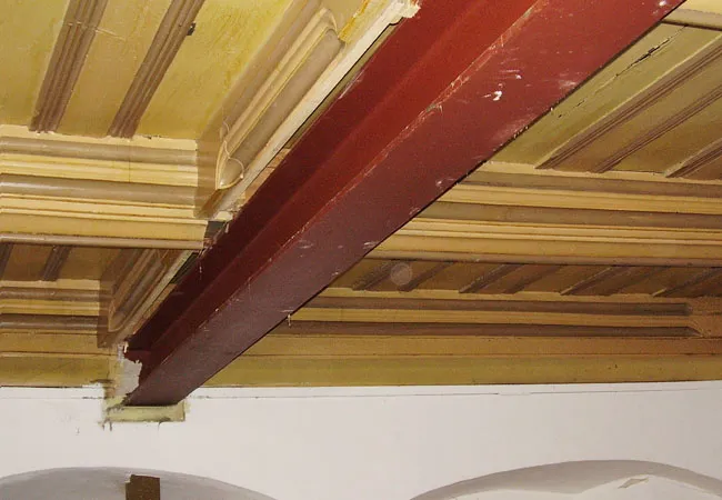 Freilegung des nachträglich eingebauten Stahlträgers (60er Jahre) unter der historischen Holzdecke.
