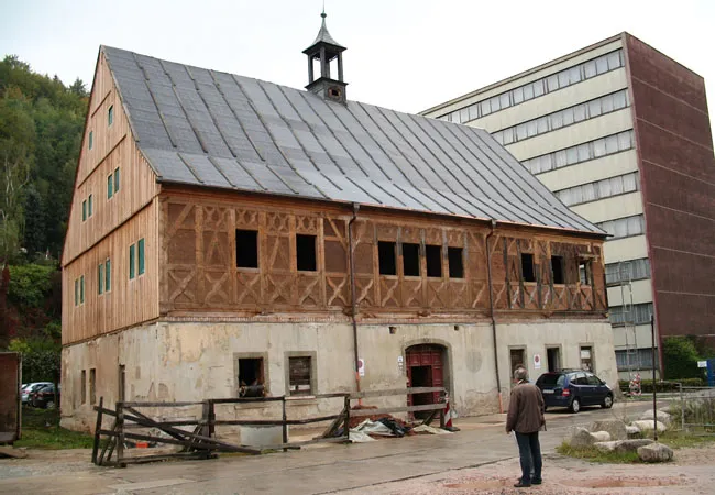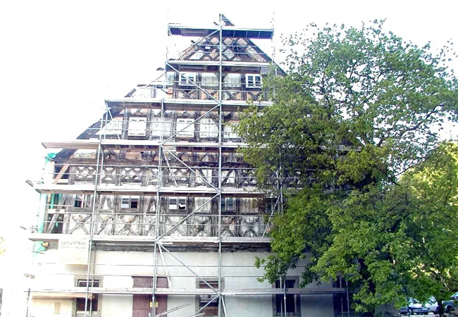 Am Ostgiebel ist die historische Konstruktion weitgehend erhalten. Schadhafte Gefache wurden instand gesetzt.