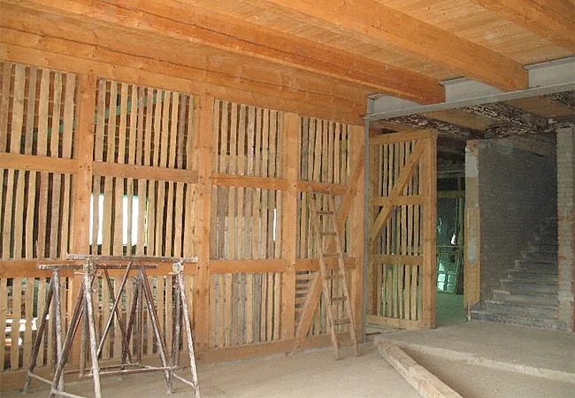 Fertigstellung von Innenwänden in Lehmbauweise.