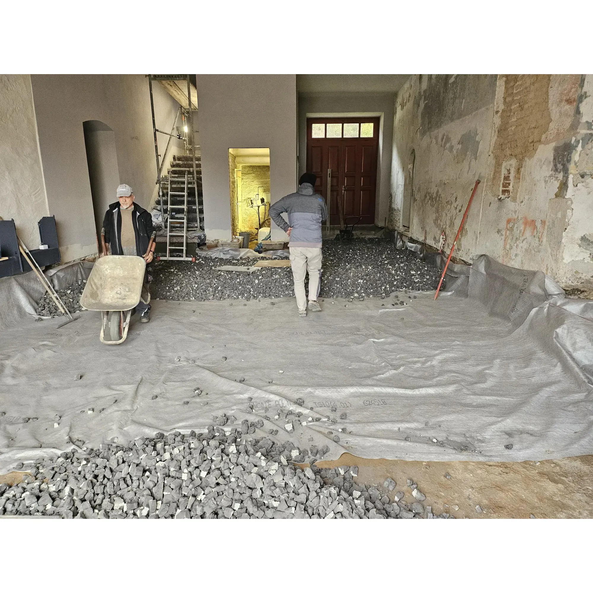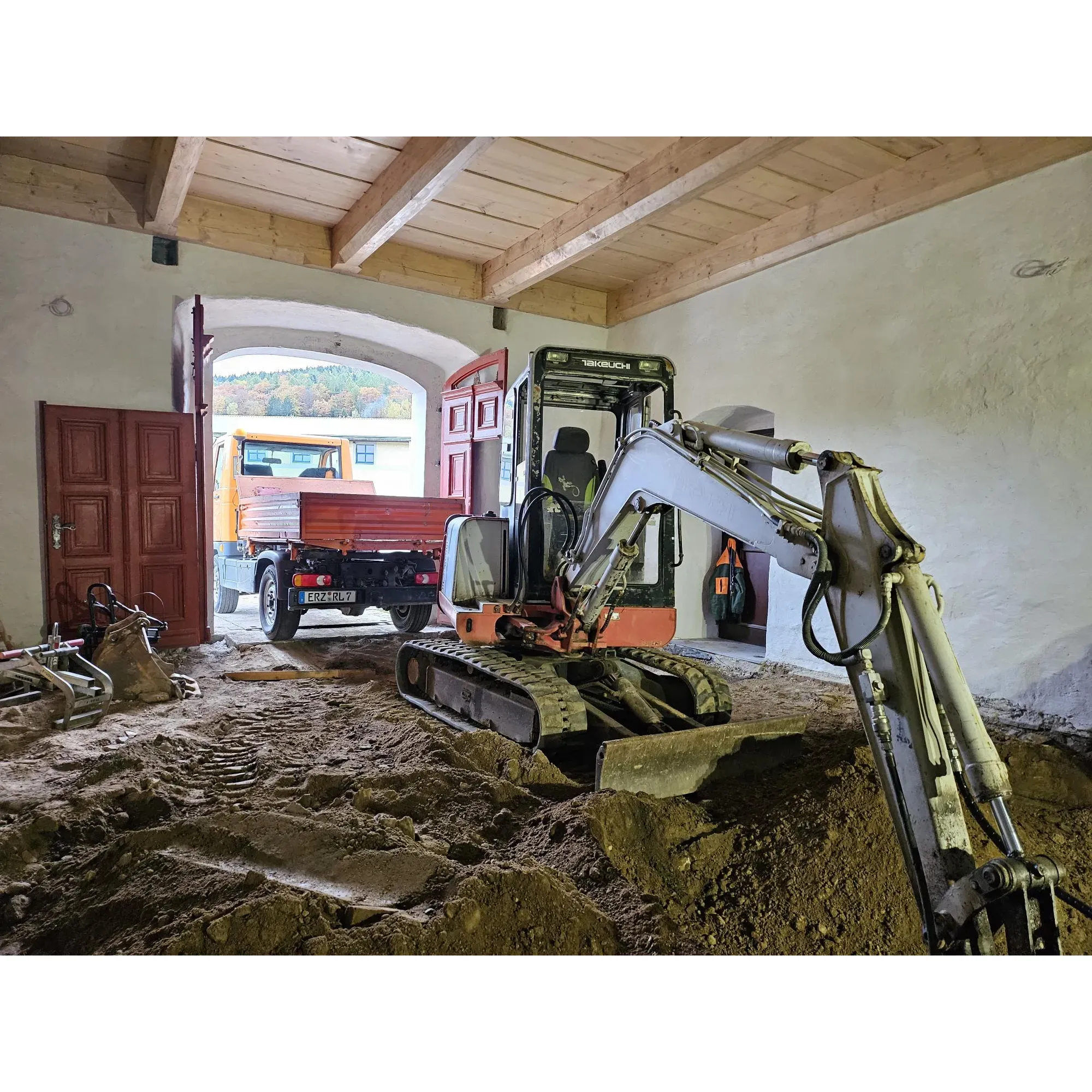 Beräumen der Bereiche über dem Gewölbe des Erdgeschosses – Fund einer alten Feuerstelle und alter Wände in diesem Abschnitt. -