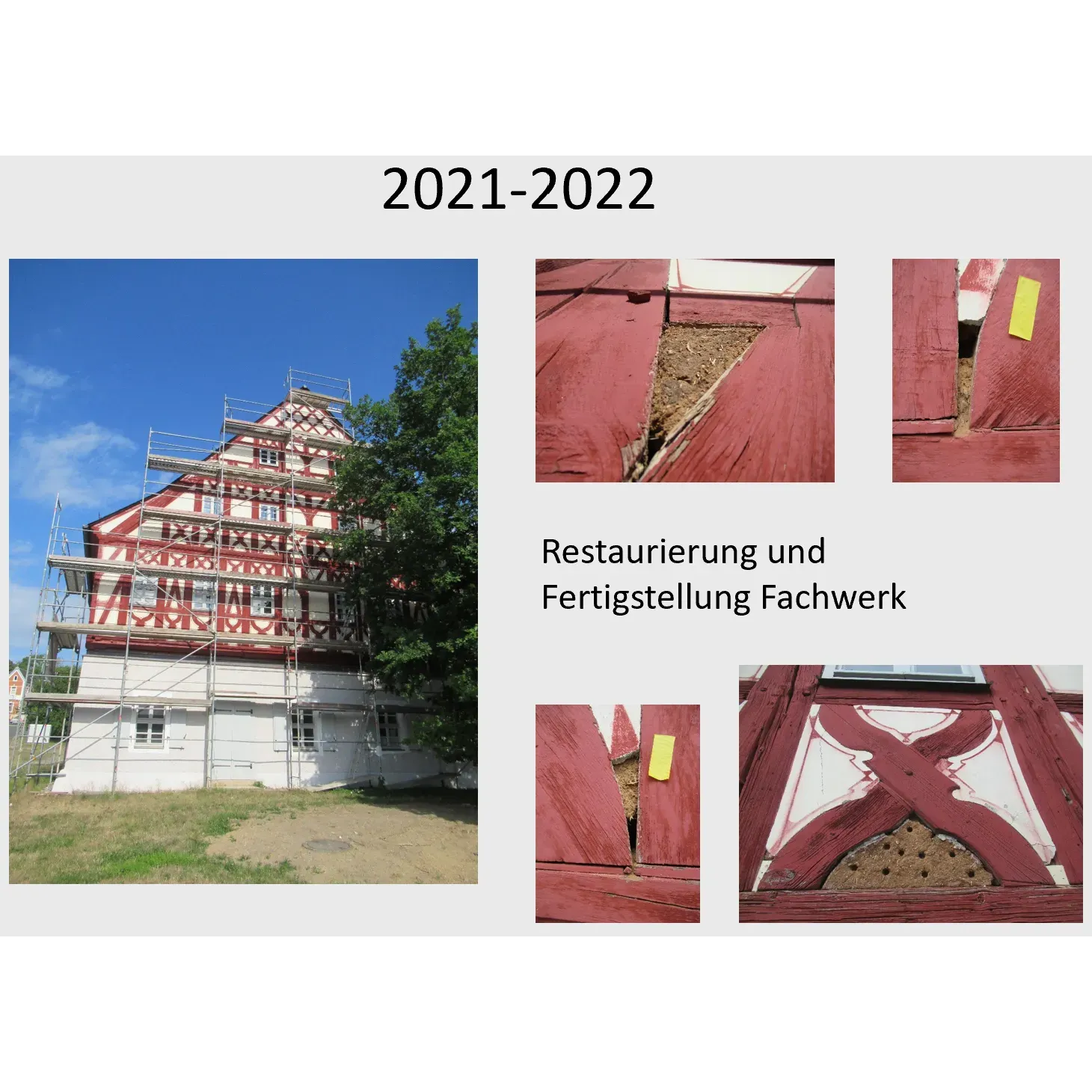 Weitere Arbeiten an den Fachwerkinnenwänden und Anbringen von Spritzbewurf auf Teilflächen des Erdgeschosses. -